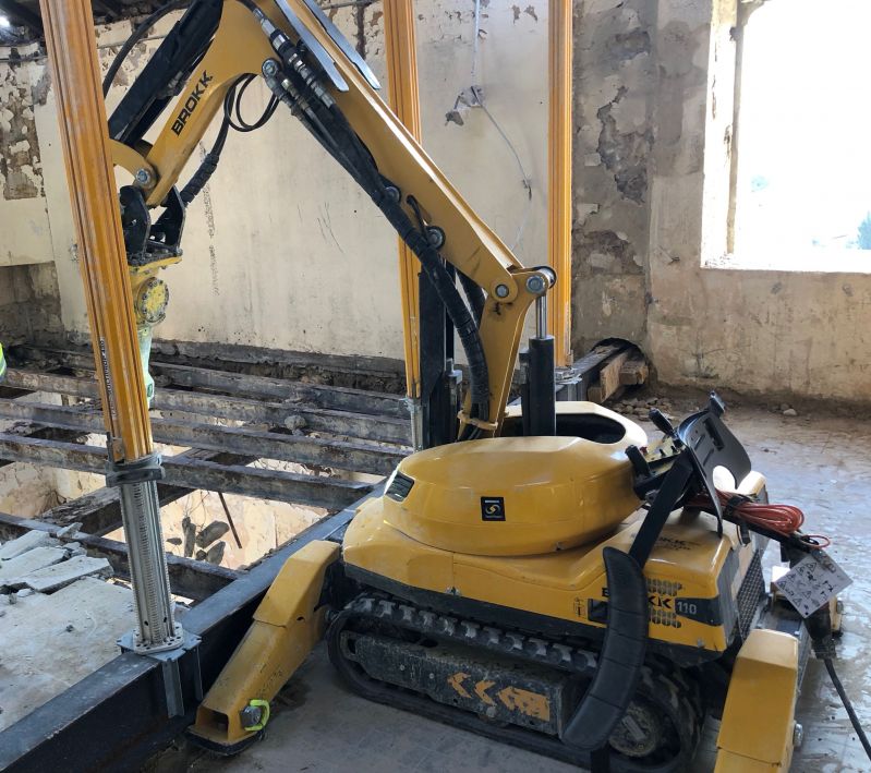 ROBOT DE DECONSTRUCTION BROKK 90 : FORSCIEDRÔME utilise ce robot radio-commandé léger d'un poids de 700kg. De plus la puissance adaptée le configure pour des déconstructions intérieures. Ces engins de démolition du bâtiment permettent aussi de travailler en présence d'un risque. Par exemple dans des démolitions après incendie, certaines zones de la déconstruction peuvent représenter un risque d'effondrement. Dans ce cas, il suffit d'envoyer un robot pour traiter les phases les plus délicates.