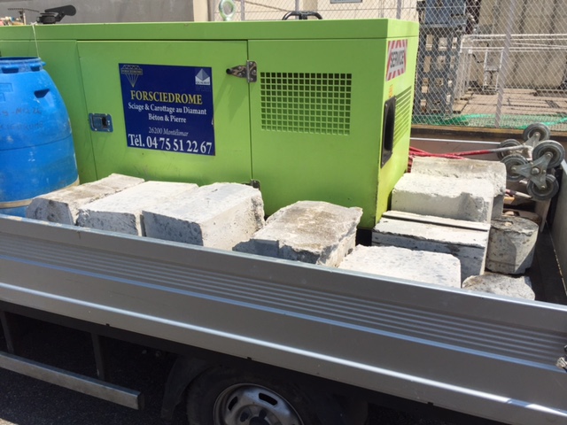 D'un mur épaisseur 30cm recouper en plusieur blocs et évacuer nous sommes autonome en électricité 380 volts 32 ampères la scie mural Permet de découper le béton armée jusqu’à 83 cm d’épaisseur tout en respectant les dimensions précises des ouvertures à créer (murs, dalles, plafonds). L’opérateur est aux commandes, toujours à distance de la machine, permettant une sécurité optimale. Pour les travaux en sites occupés, des protections aux sols, murs et plafonds sont mises en place, accompagnées d’aspirateurs à eau pour ne pas détériorer les installations avoisinantes.